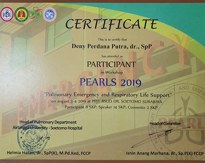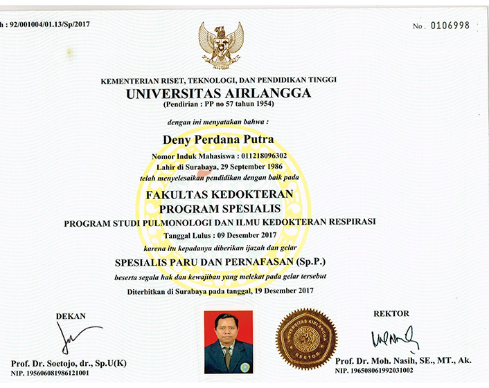 Program Spesialis Studi Pulmonologi dan Ilmu Kedokteran Respirasi 2012-2017Setelah selesai 6 tahun menyelsaikan Program Studi Kedokteran, akhirnya melanjutkan pendidikan ke jenjang yang lebih tinggi, dengan mengambil Program Spesialis Studi Pulmonologi dan Ilmu Kedokteran Respirasi pada Universitas Airlangga Surabaya, yang terletak di Jl. Mayjen Prof. Dr. Moestopo No.6-8, Kota Surabaya.